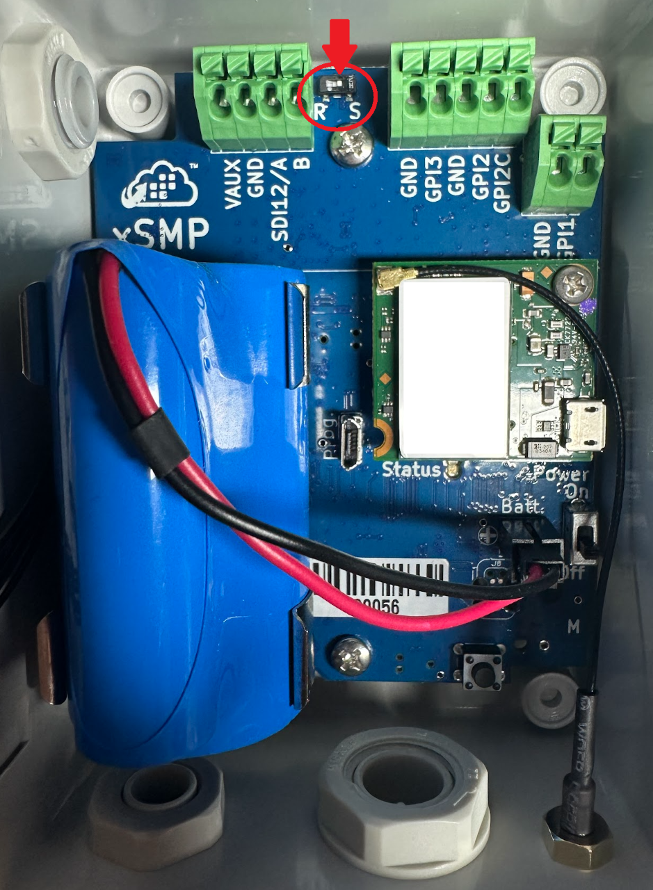 - There is a small switch next to the green connector, labeled R-S. For best reliability, the white marker on the switch should point towards the “S” letter for SDI-12 mode. The first batch of devices might have some of the switches pointing towards the “R” letter. If this is the case, please use a needle to slide the switch towards the “S” letter.